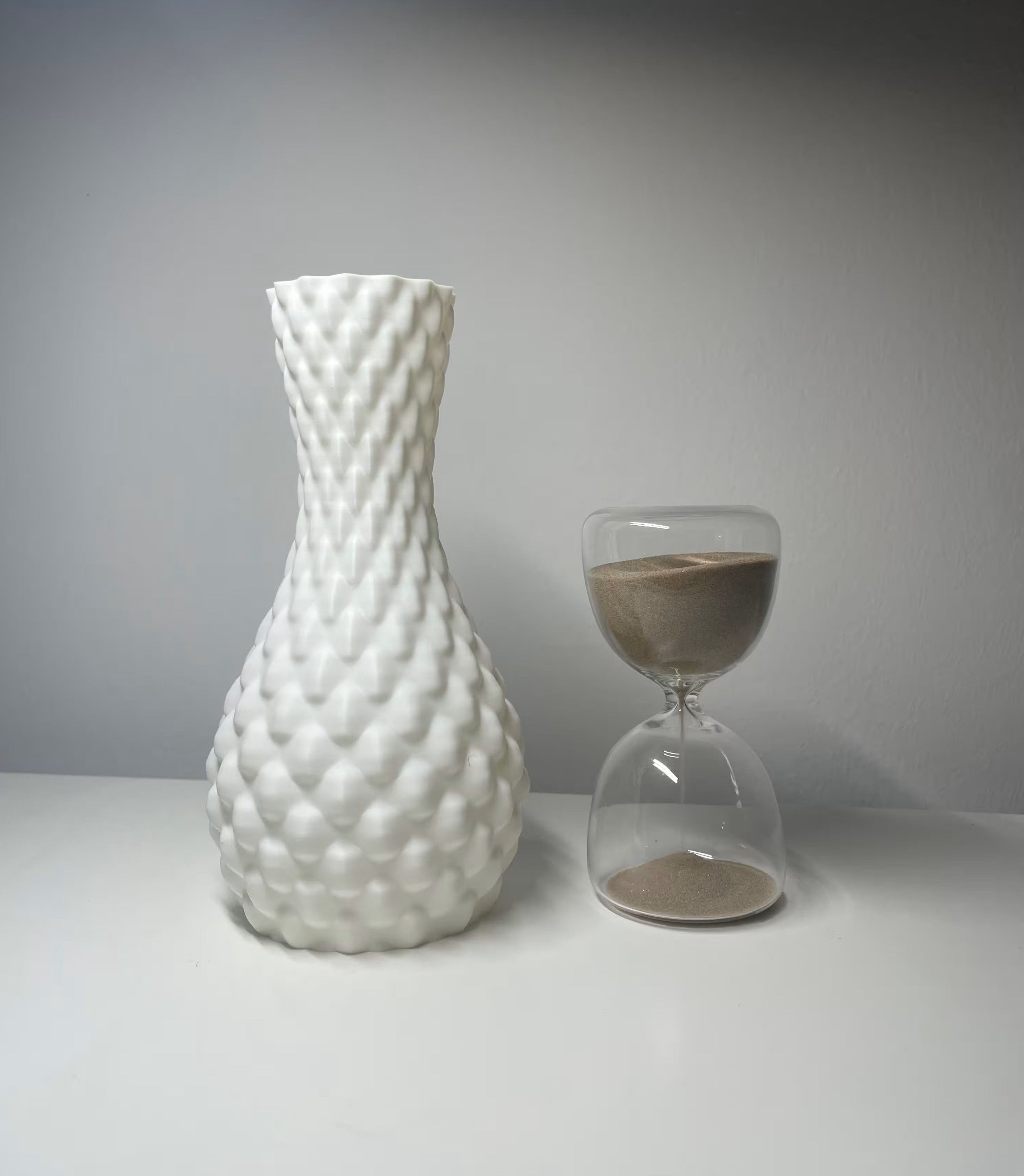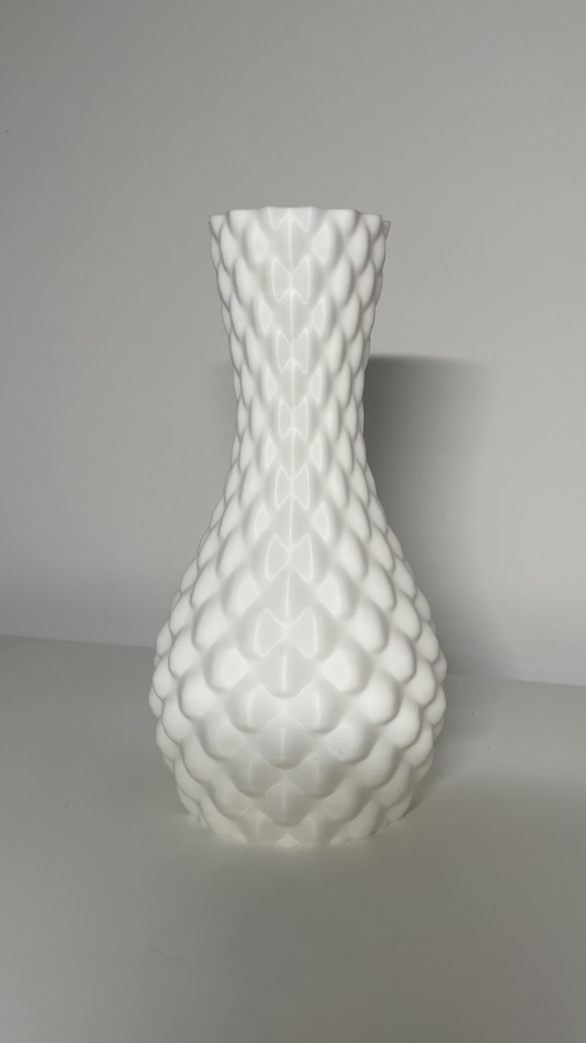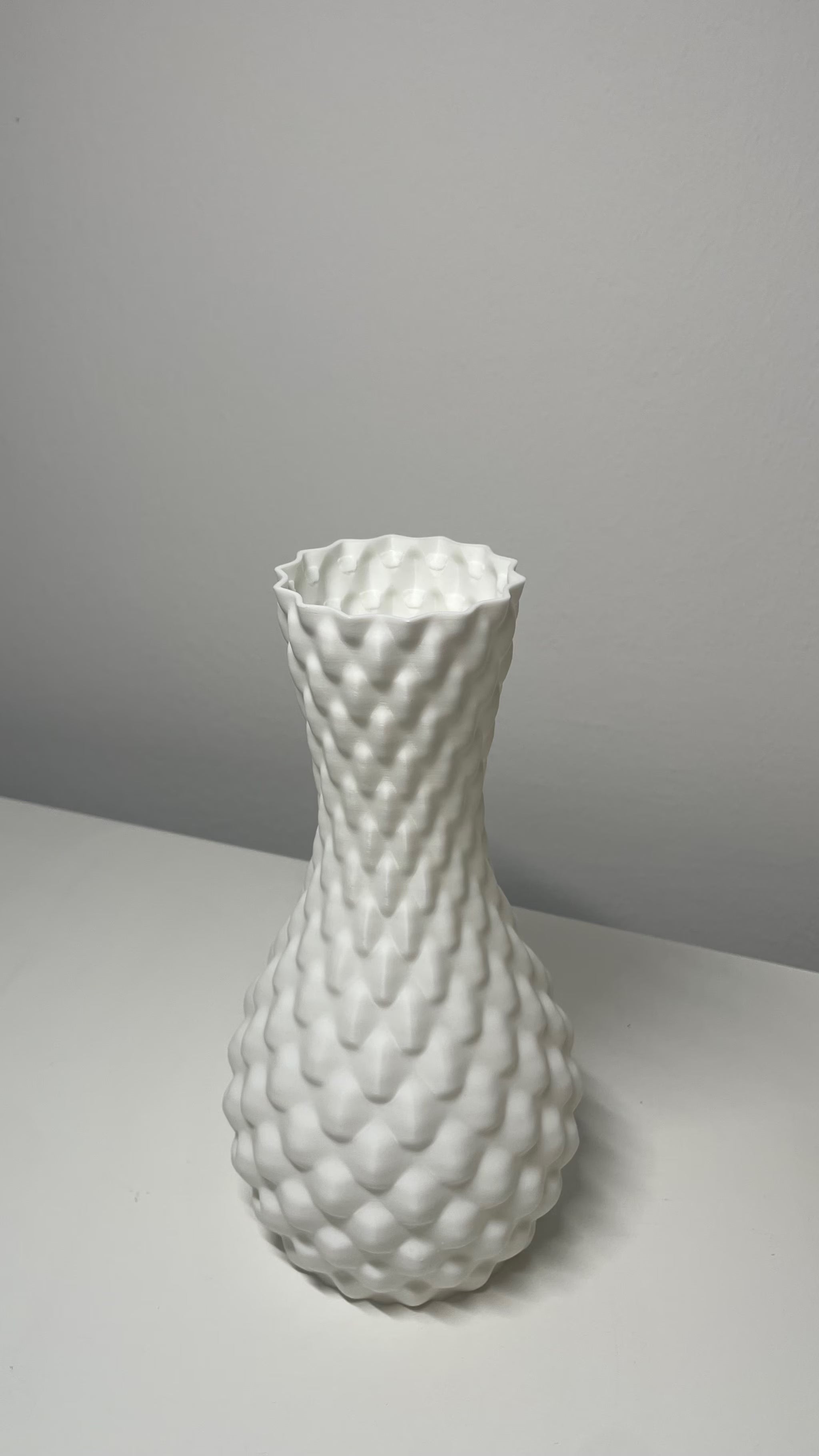 Besonders auffällig sind die noppenartigen Ornamente, die der Vase eine interessante Haptik und optische Tiefe verleihen. So entsteht ein Spiel aus Licht und Schatten, das je nach Umgebung für unterschiedliche Effekte sorgt.