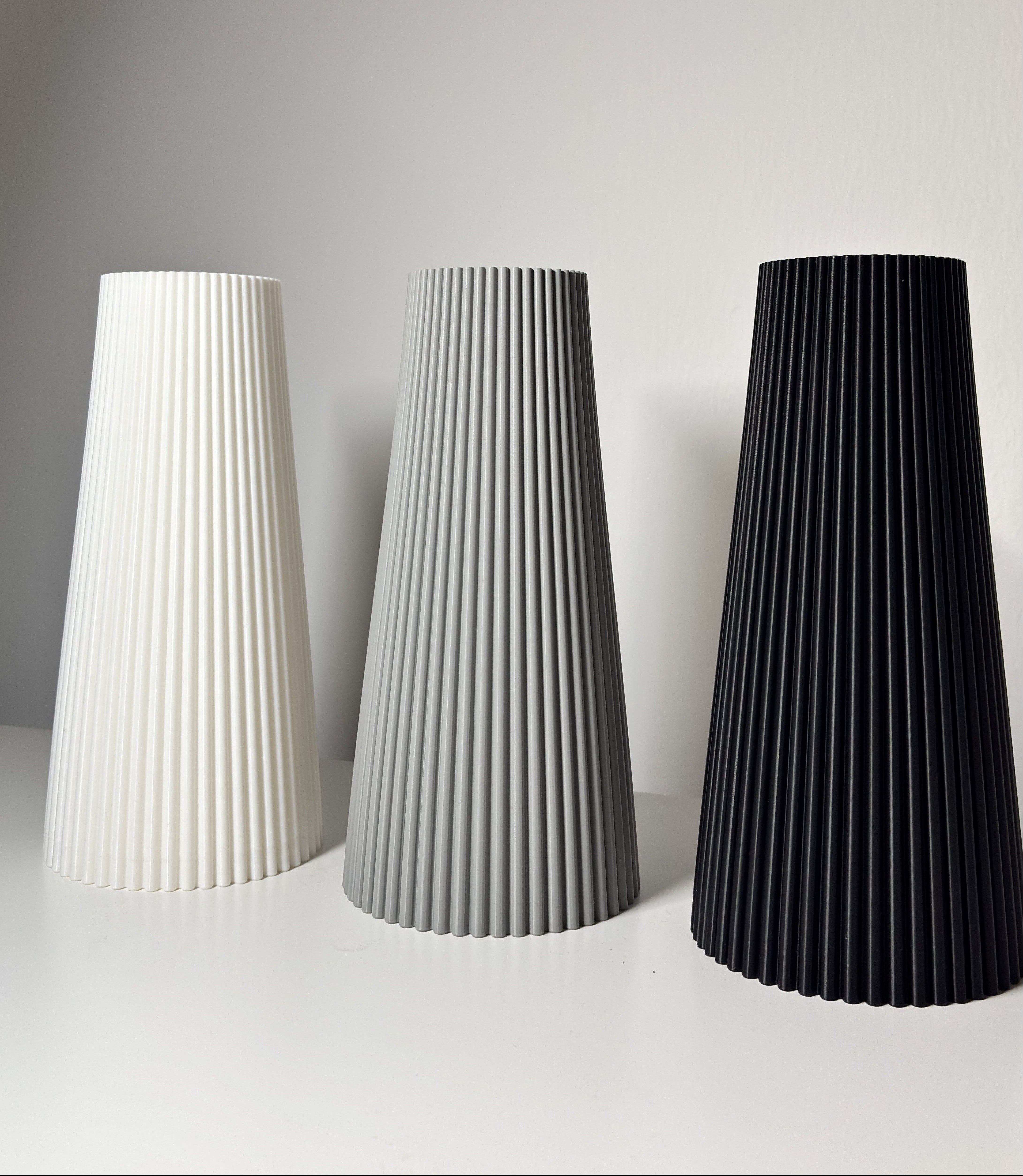Diese edle Vase überzeugt durch ihr puristisches Design und ihre präzise vertikale Linienführung. Feine Rillen verleihen der Oberfläche Struktur und Tiefe, ohne aufdringlich zu wirken. Die Form – unten leicht breiter, nach oben hin sanft verjüngt – unterstreicht die elegante Silhouette und sorgt für einen harmonischen Gesamteindruck.